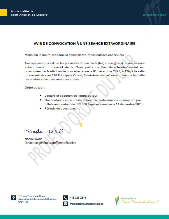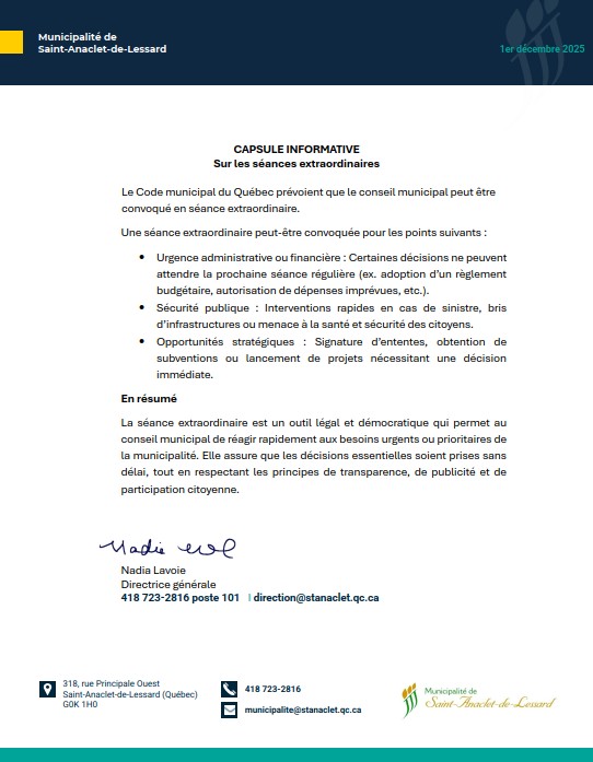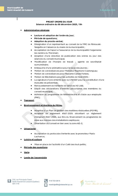 Calendrier des séances publiques du conseil municipal qui se tiendront à 19 h, au 318, rue Principale Ouest à la salle du conseil au 2e étage.